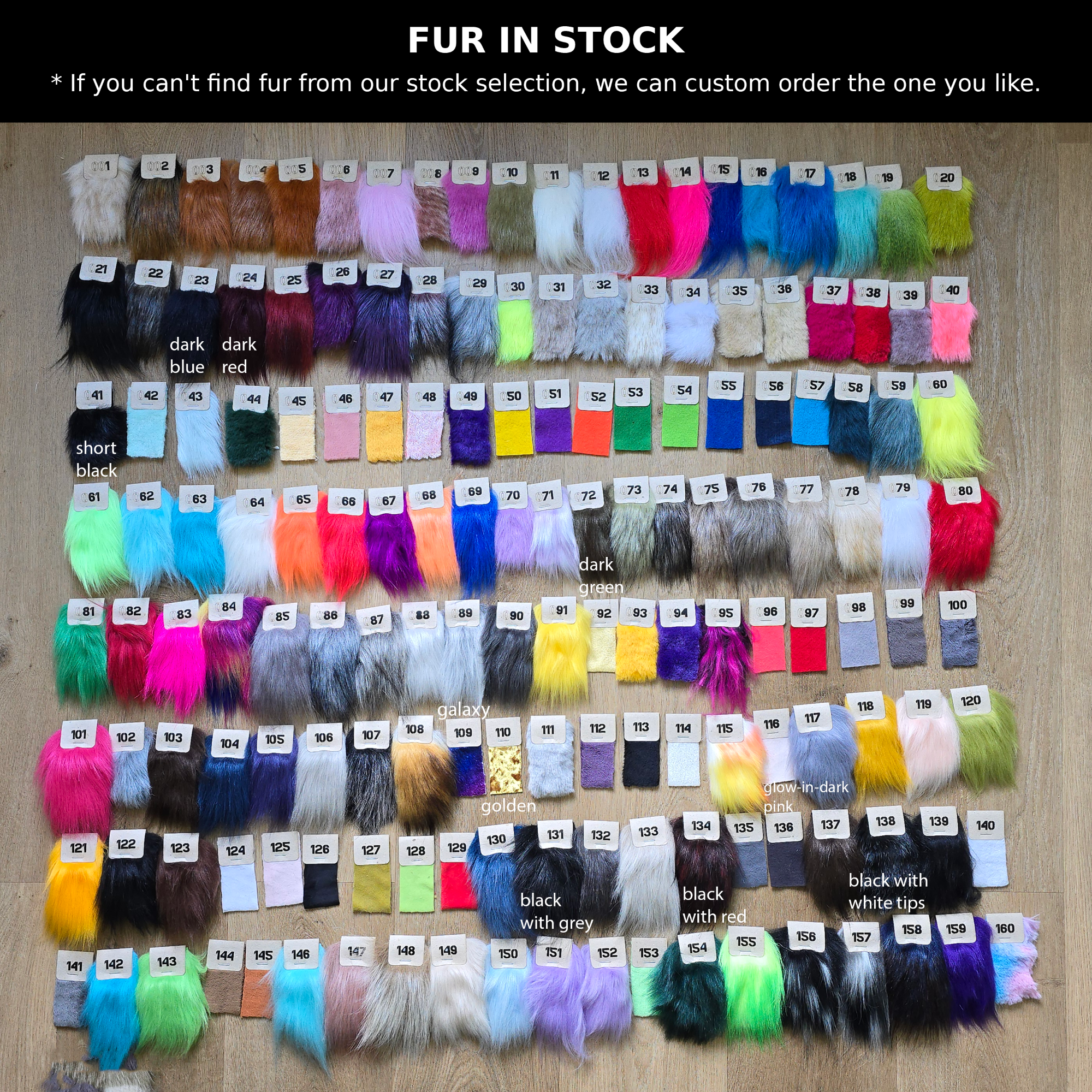 Here are the fur colors and types we currently have in stock! Take a look and let us know which ones you'd like to use for your fursuit commission.